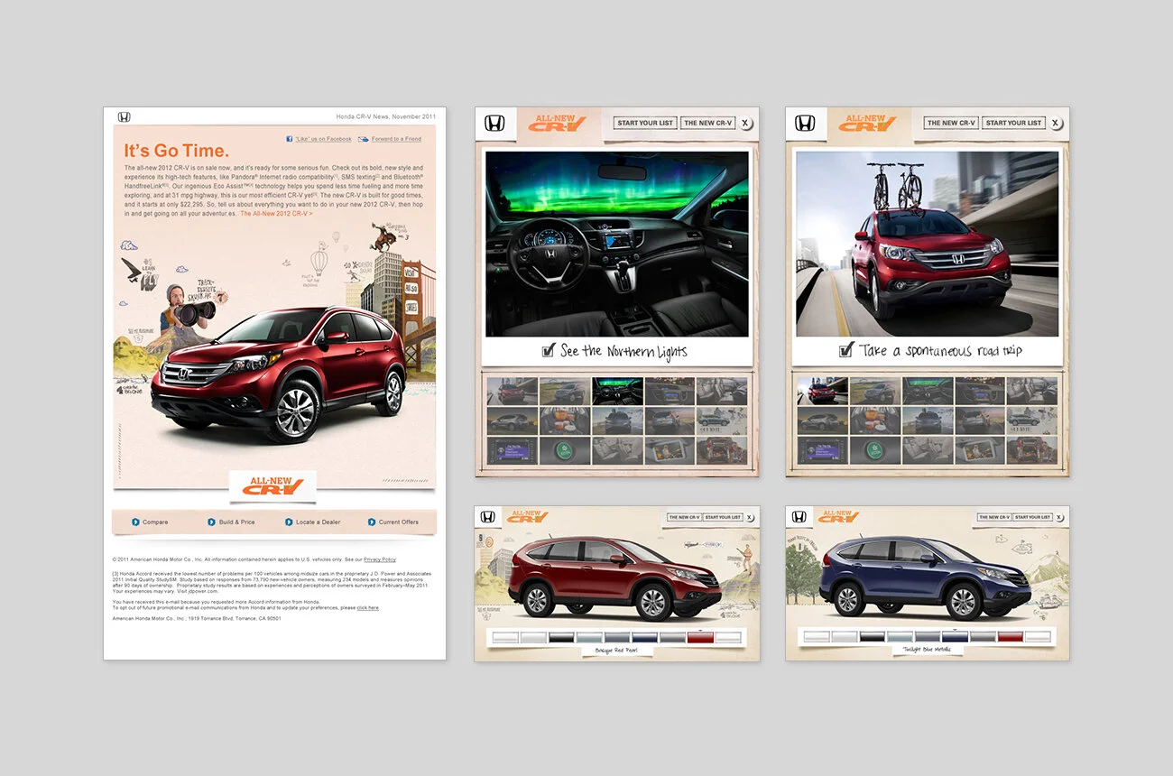 The All-New CR-V launched with a campaign idea called “The Leap List.” It encouraged people to make a list of everything they wanted to do before they settled down. The CR-V was positioned as the vehicle to help them tackle that list. To support the launch and extend the campaign, we created a website where people could create and share their Leap Lists, a dealership brochure, regional dealership support videos, as well as a variety of banner ads using both standard and rich media.