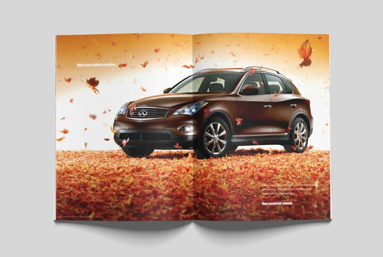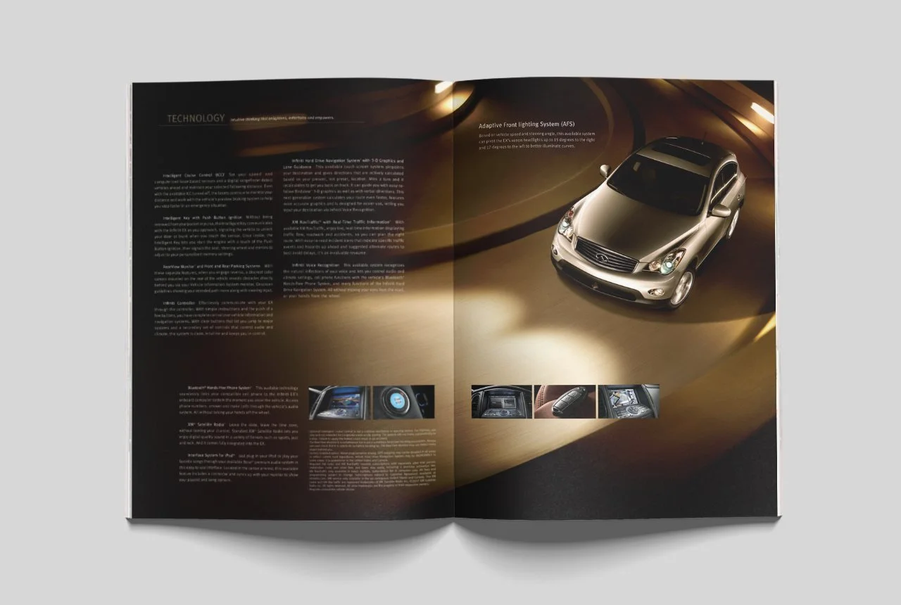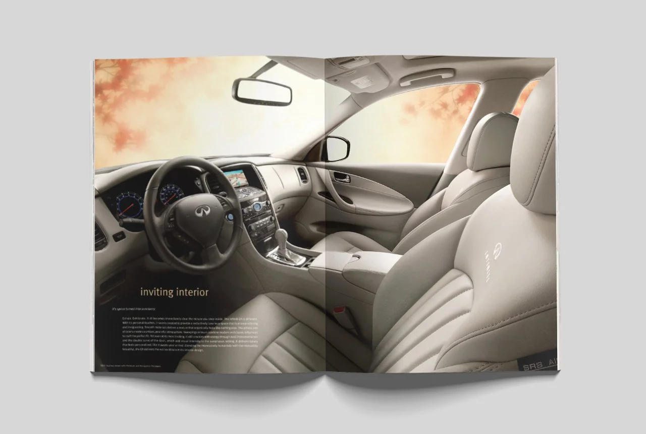 The Infiniti EX launched with a whole host of comfort, convenience and industry leading technology features. To showcase them in a way that allowed them to take center stage, we created a brochure concept that presented each feature like a full spread magazine advertisement. Using conceptual visuals, smart illustrations, and stunning photography we created a rich and engaging presentation that not only gave viewers a fantastic look at the vehicle and its features, but also allowed us to immerse them in many of the interesting interior and exterior design stories.