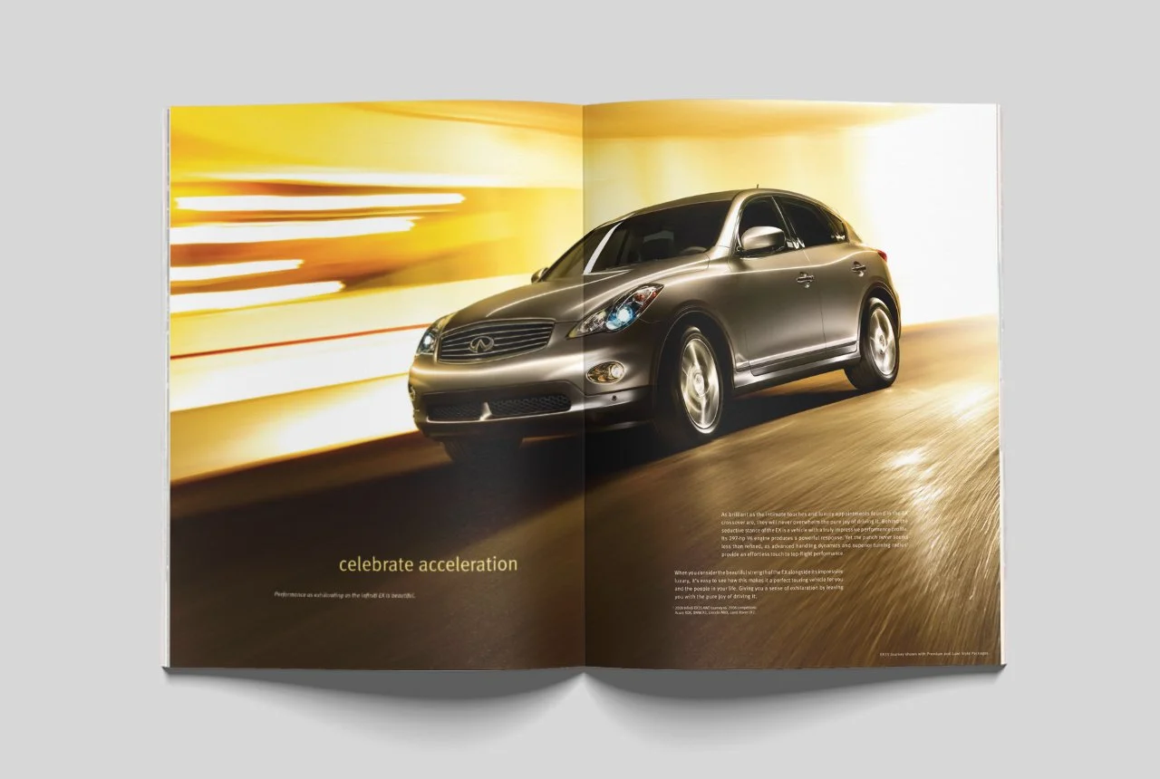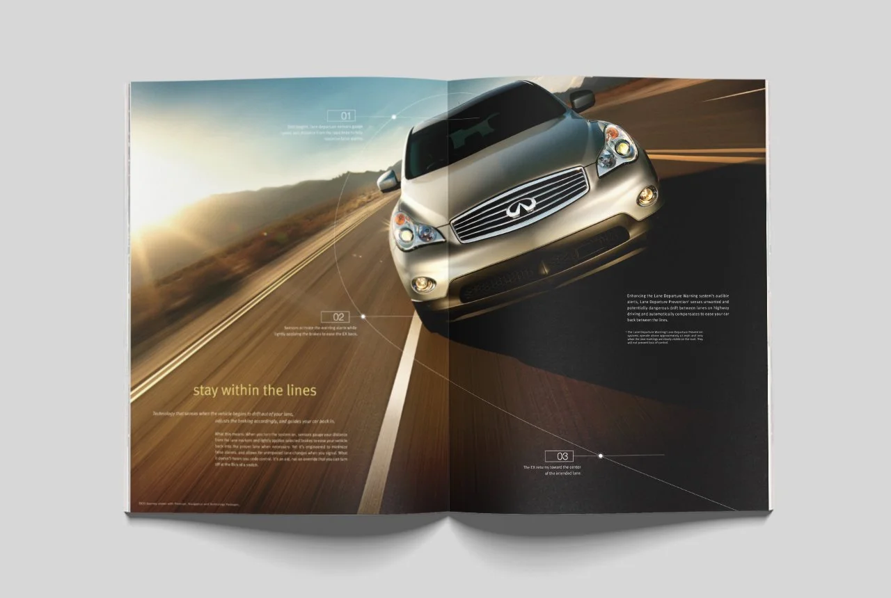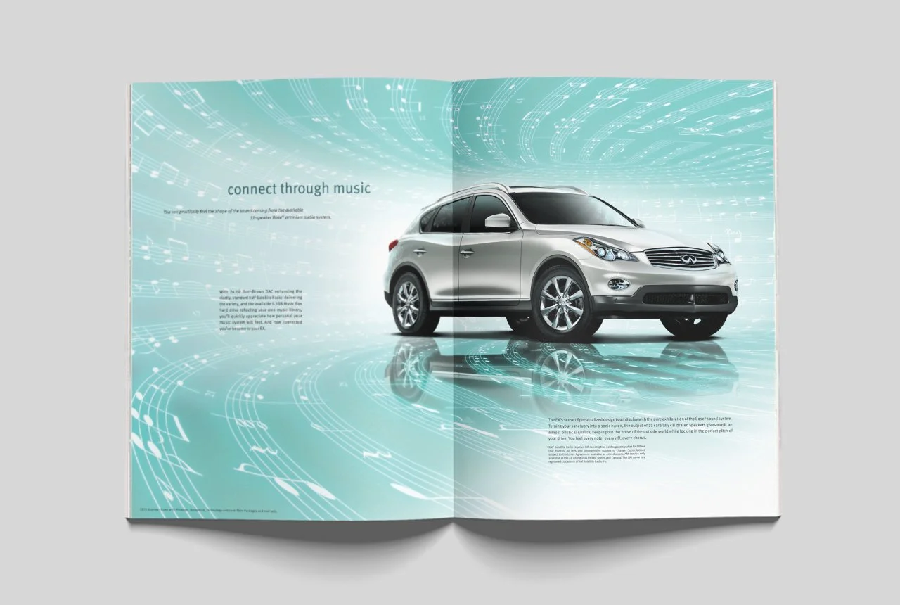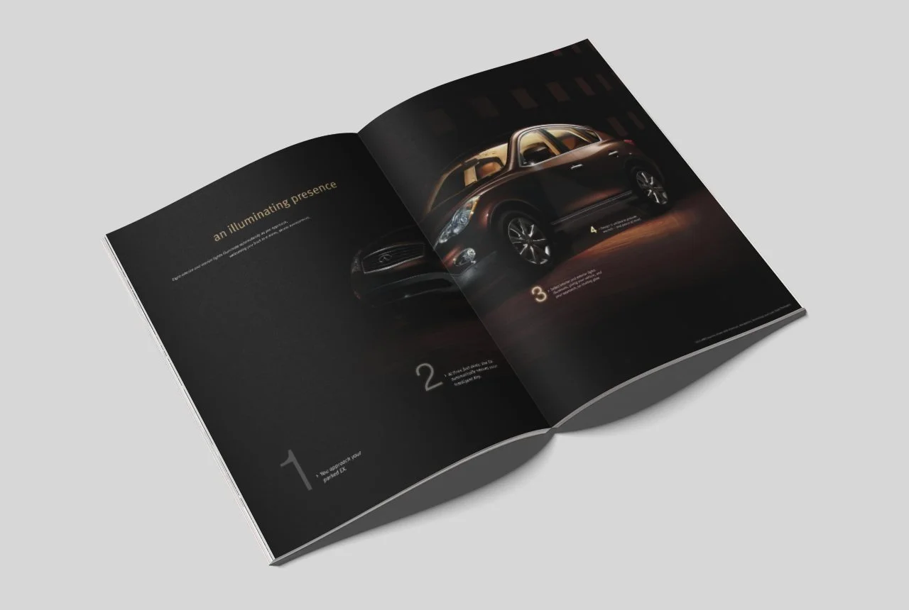 The Infiniti EX launched with a whole host of comfort, convenience and industry leading technology features. To showcase them in a way that allowed them to take center stage, we created a brochure concept that presented each feature like a full spread magazine advertisement. Using conceptual visuals, smart illustrations, and stunning photography we created a rich and engaging presentation that not only gave viewers a fantastic look at the vehicle and its features, but also allowed us to immerse them in many of the interesting interior and exterior design stories.